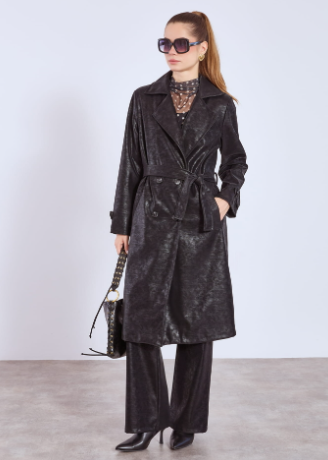 Συνδύασε το μαύρο παλτό με μαύρο παντελόνι, ζιβάγκο και ankle boots. Πρόσθεσε ένα μεταλλικό αξεσουάρ ή μια τσάντα με αλυσίδα για μοντέρνα πινελιά.