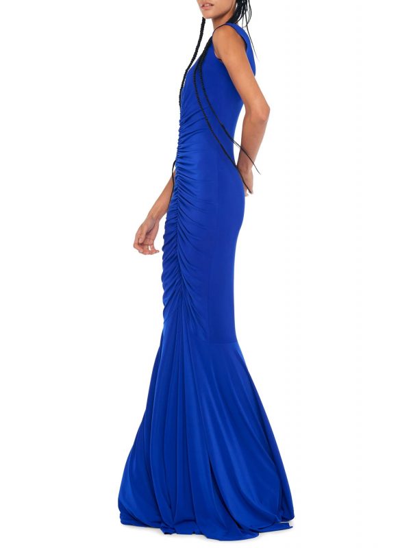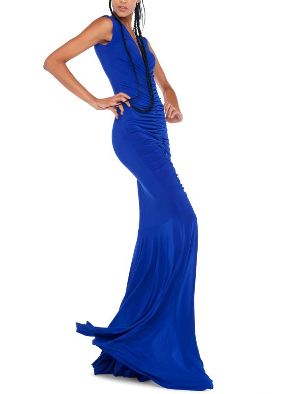 NORMA KAMALI ΦΟΡΕΜΑ SLEEVELESS V NECK SHIRRED FRONT FISHTAIL GOWN ΗΛΕΚΤΡΙΚ ΜΠΛΕ